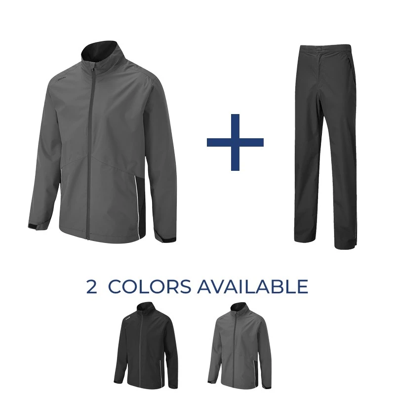 Waterproof PING golf raisuit engineered for waterproof protection in wet weather.